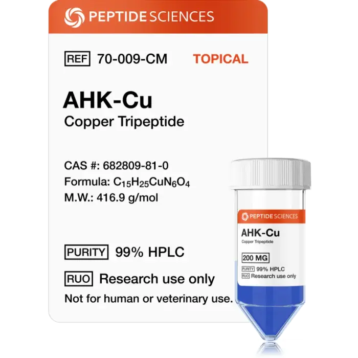 Envision radiant skin that defies age and hair that thrives with strength and vitality. AHK-Cu 200 mg topical from Peptide Sciences USA, a copper-bound peptide, makes this possible. Known as Copper Tripeptide-3, AHK-Cu stimulates collagen production, smooths wrinkles, and promotes hair follicle health, offering a science-backed solution for anti-aging and skin health research.
