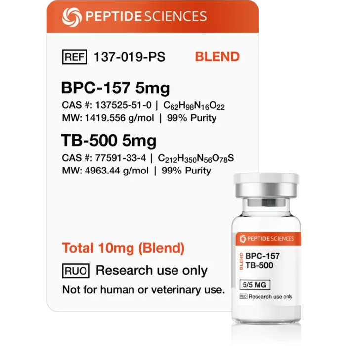 The BPC-157/TB-500 10 mg blend combines 5 mg of BPC-157, a pentadecapeptide from human gastric juice, with 5 mg of TB-500, a Thymosin Beta-4 fragment. It's designed for research into synergistic tissue repair and inflammation reduction.