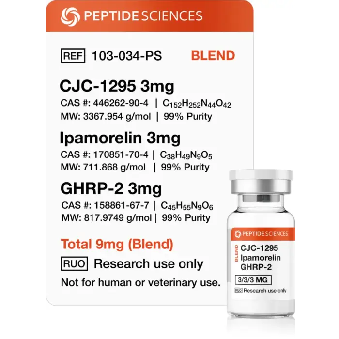 CJC-1295 / Ipamorelin / GHRP-2 9 mg is supplied for research purposes only and is not FDA-approved for human use, though CJC-1295 DAC reached phase II trials. It is banned by the World Anti-Doping Agency (WADA) for performance-enhancing use. It is not intended to diagnose, treat, cure, or prevent any condition. Consult a licensed professional before use. Peptide Sciences USA assumes no liability for misuse. All information is educational and based on preclinical research.