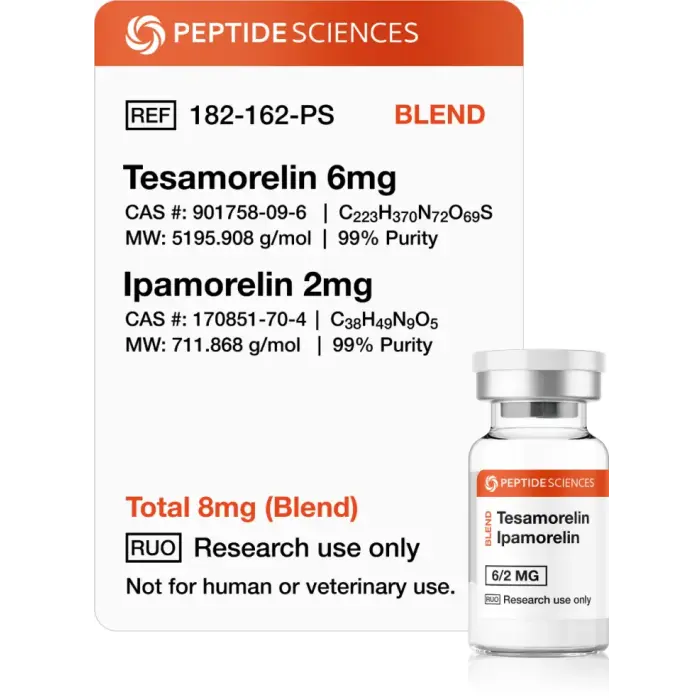 Duo-Blend Tesamorelin / Ipamorelin 8 mg is supplied for research purposes only and is not FDA-approved for human use, though Tesamorelin is FDA-approved for HIV-associated lipodystrophy. It is banned by the World Anti-Doping Agency (WADA) for performance-enhancing use. It is not intended to diagnose, treat, cure, or prevent any condition. Consult a licensed professional before use. Peptide Sciences USA assumes no liability for misuse. All information is educational and based on preclinical research.