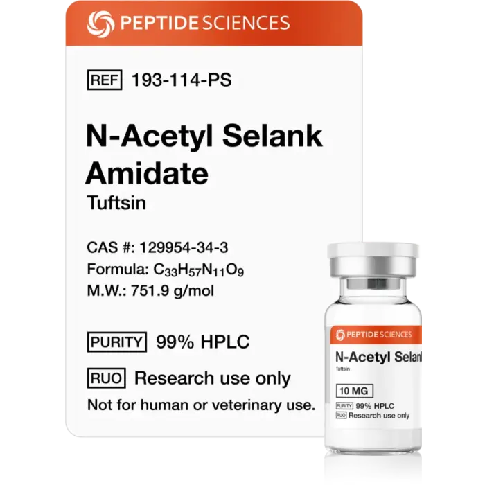 N-Acetyl Selank Amidate 10 mg is supplied for research purposes only and is not FDA-approved for therapeutic use outside Russia and Ukraine, per regulations as of 2025. It is banned by the World Anti-Doping Agency (WADA) for performance-enhancing use. It is not intended to diagnose, treat, cure, or prevent any condition. Consult a licensed professional before use. Peptide Sciences USA assumes no liability for misuse. All information is educational and based on preclinical and clinical research.