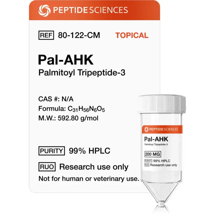 Pal-AHK (Palmitoyl Tripeptide-3, sequence: Pal-Gly-His-Lys) is a synthetic peptide that mimics collagen fragments, stimulating collagen and elastin synthesis via TGF-β activation. The palmitic acid tail enhances skin penetration, targeting fibroblasts to increase extracellular matrix production. In human studies, a 3% Matrixyl 3000 formulation (containing Pal-GHK and Palmitoyl Tetrapeptide-7) reduced deep wrinkle surface area by 39.4% after 2 months.